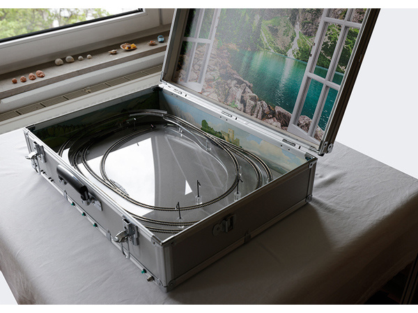 Es wurde eine Modellbahnskulptur mit einem Gleisplan mit Raffiness über zwei Ebenen speziell für diesen Koffer entworfen.