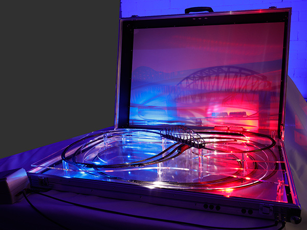 Die Brücke muss nicht abgenommen werden. Die Modellbahnskulptur ist im Koffer gut aufbewahrt.